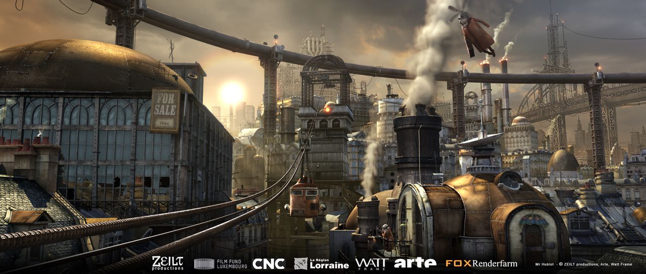 这是一栋弥漫着漫长历史气息的老房子,墙上挂满了照片,屋顶上的灯接触不良,几经开关才能点亮。房主人哈布洛先生头戴精密仪器,他推开阳台的门,眼前竟然呈现一个硕大笨重却精密、带着极强蒸汽朋克气息的机械世界,每个人都戴着精密的机械眼镜和头盔。甚至连窗台上的花和路边的狗也都是工业化的产物。