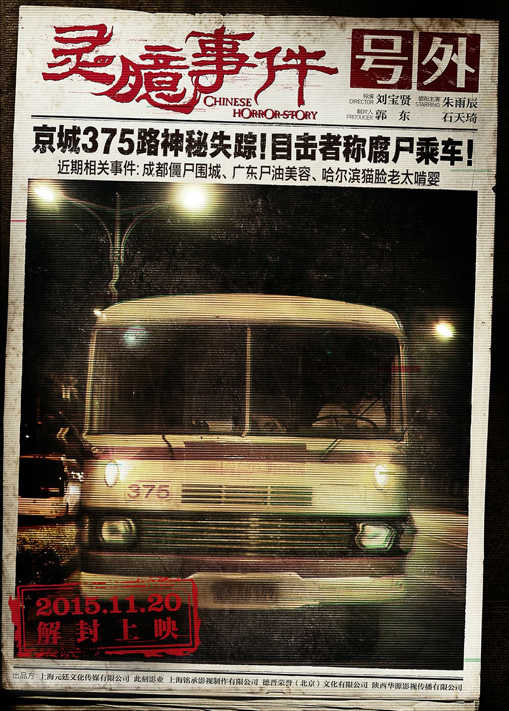 幕后花絮该片根据真实发生的“中国四大灵异事件”改编,包括北京375路公交车事件、成都僵尸事件、广东尸油事件、哈尔滨猫脸老太事件。
