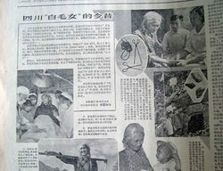 大春救喜儿未成,投奔红军。怀有身孕的喜儿在黄家女佣张二婶的帮助下逃离虎口,途中生下婴儿,旋即夭折。后独自入深山穴居,餐风宿露。由于长期缺少盐分摄入,一头青丝变成白发。喜儿因常至破庙中取供品充饥,被村人迷信视为“白毛仙姑”下凡显灵。