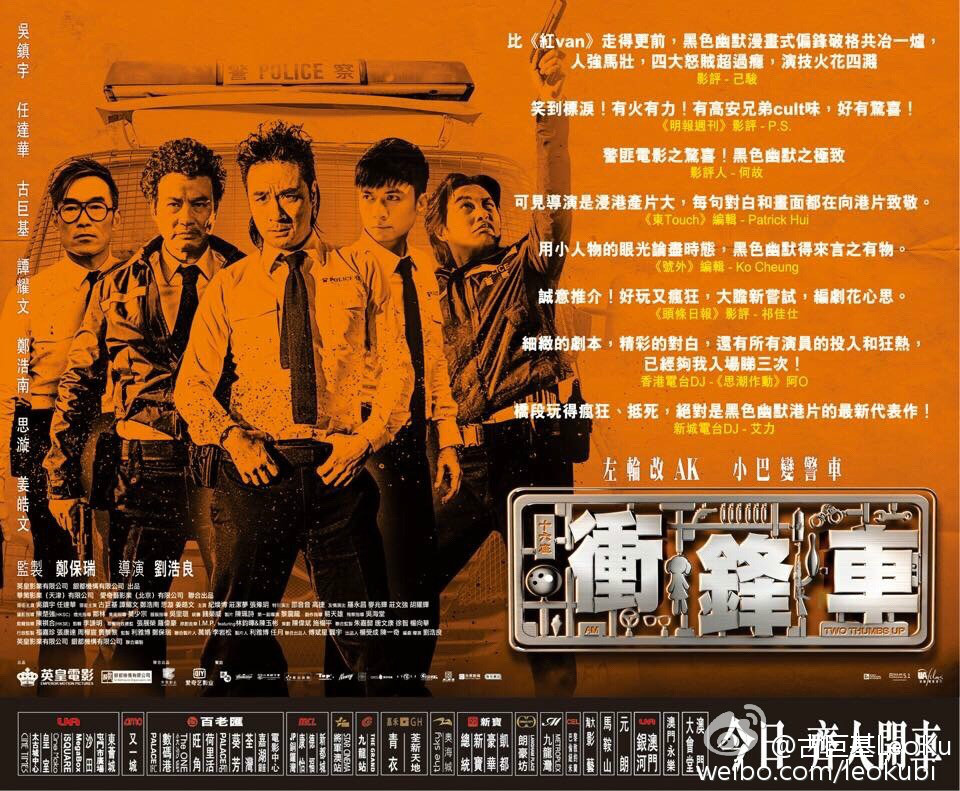 冲锋车(Two Thumbs Up)是一部由英皇电影、银都娱乐在中国香港拍摄,集动作 喜剧 犯罪于一身的精彩影片,综合评分为 6.90 。于2015年4月2日 上映,全片时长103分钟。演员阵容:吴镇宇、任达华、古巨基、谭耀文、郑浩南、姜皓文、思漩、麦兆辉、庄文强、罗永昌、胡耀辉、高捷、邵音音、庄洁梦、纪焕博 <查看完整演员表>