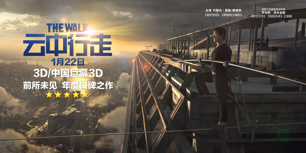 拍摄背景《云中行走》是由美国三星影业出品的传记剧情片,中国电影集团公司进口,中国电影股份有限公司、华夏电影发行有限责任公司联合发行,由罗伯特·泽米吉斯执导,约瑟夫·高登-莱维特、夏洛特·莱本、本·金斯利领衔主演。